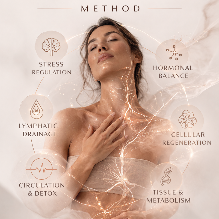 Im Zentrum dieser Methode steht die Idee, dass der Körper als komplexes, miteinander verbundenes System funktioniert. Daher werden bei der Behandlung mehrere Prozesse parallel aktiviert: Hautregeneration, Entgiftung, Durchblutung, Lymphdrainage und Gewebestraffung. Durch diese simultane Aktivierung entsteht ein deutlich intensiverer Effekt als bei klassischen Einzelbehandlungen.